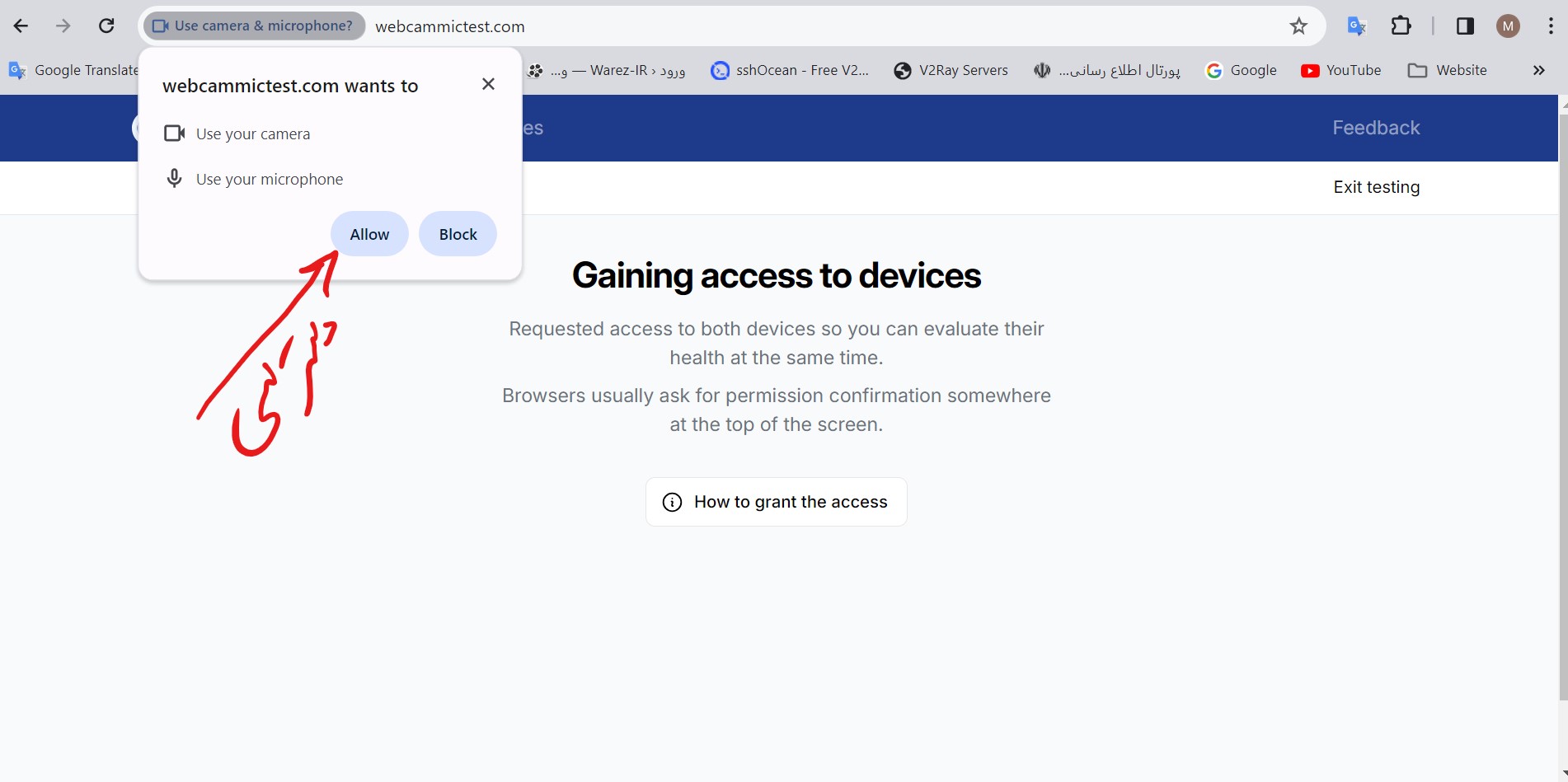 کافیه روی شروع تست کلیک کنید و در صورت نیاز َAllow رو انتخاب کنید تا تصویر خودتون رو ببیند